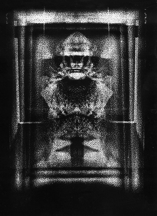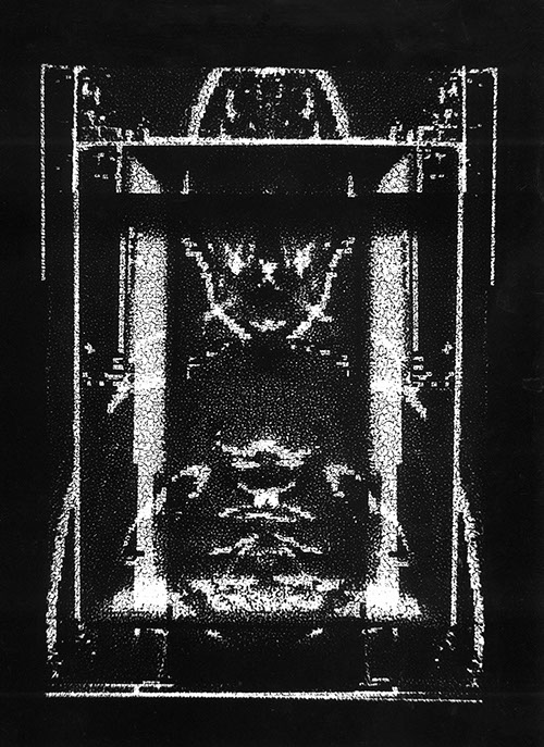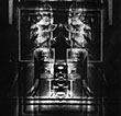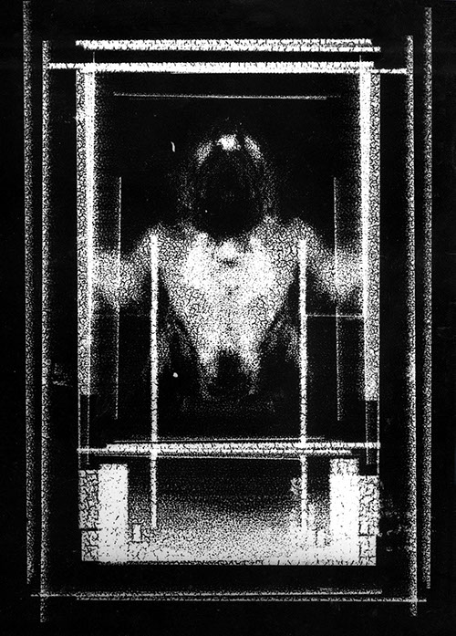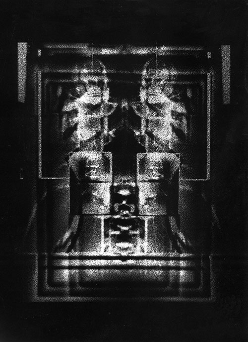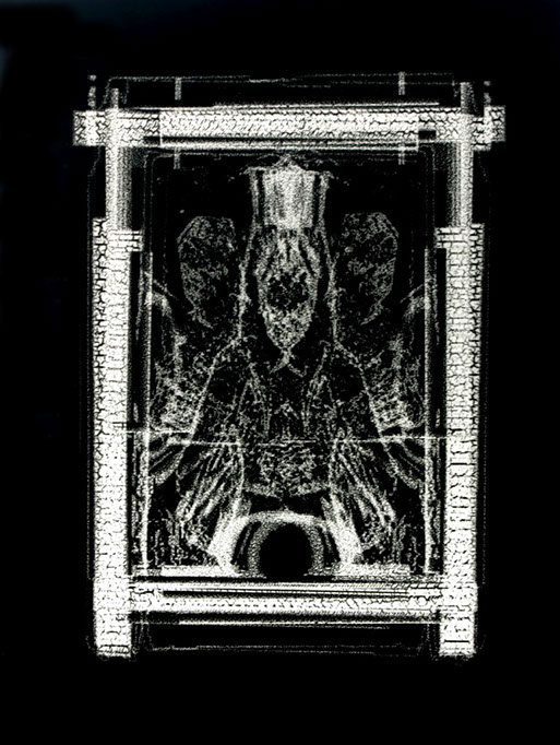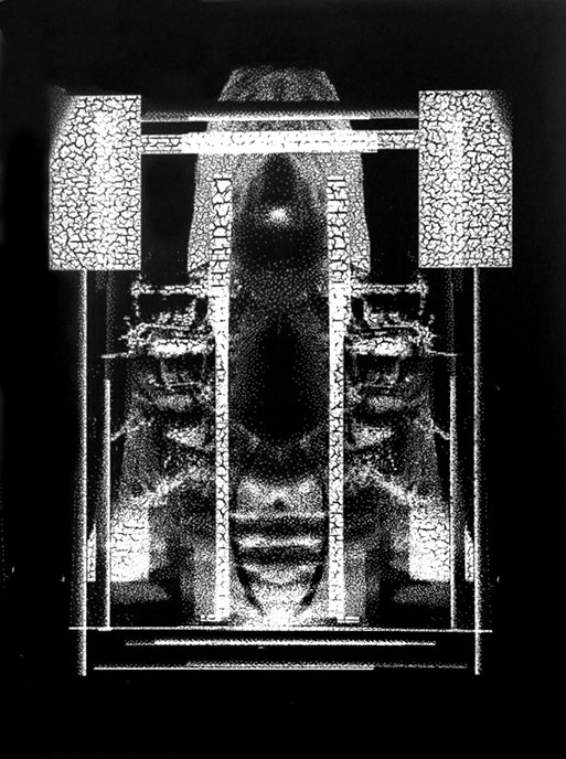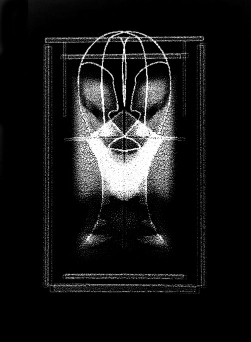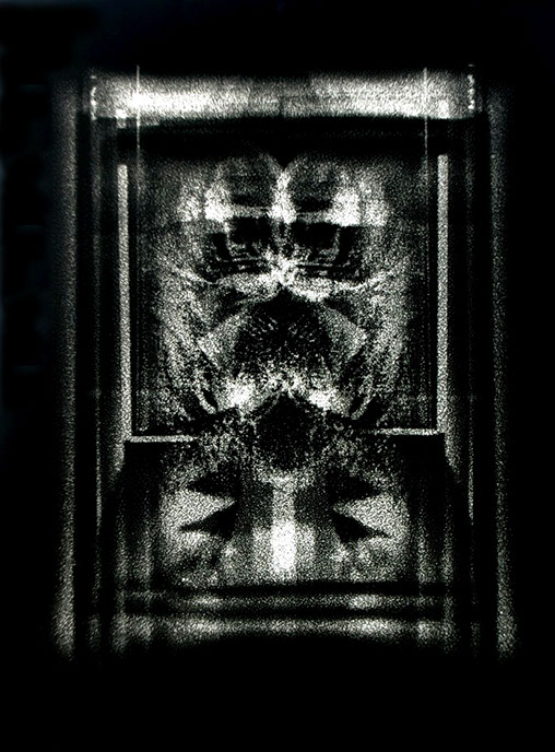 Powstały w wyniku przetworzeń wyjściowy obraz negatywowy, zostaje przeze mnie połączony z jego odbiciem zwierciadlanym. Powstają więc obrazy oparte na symetrycznym, osiowym zestawieniu. Tworzy się rodzaj