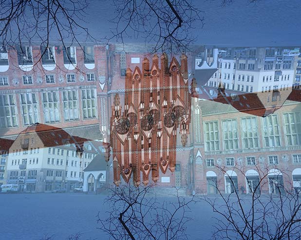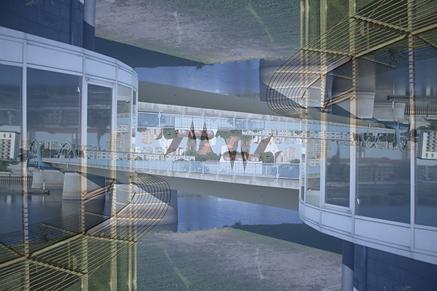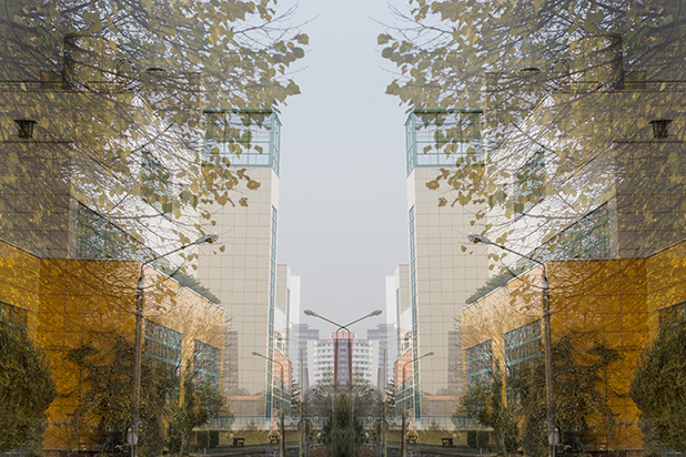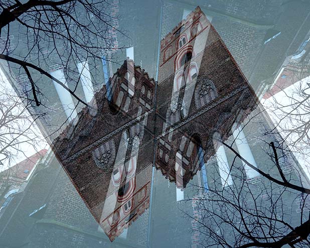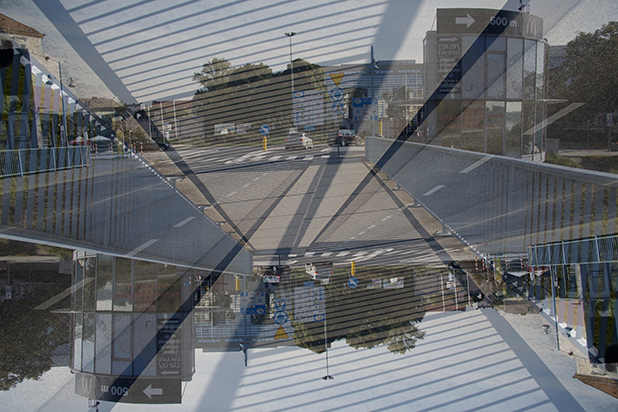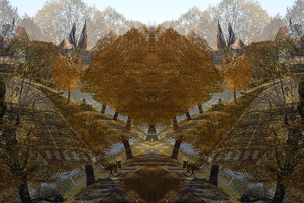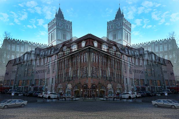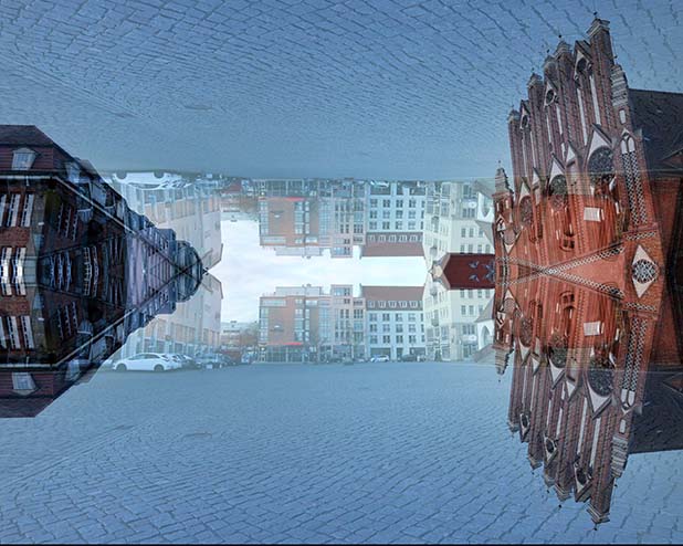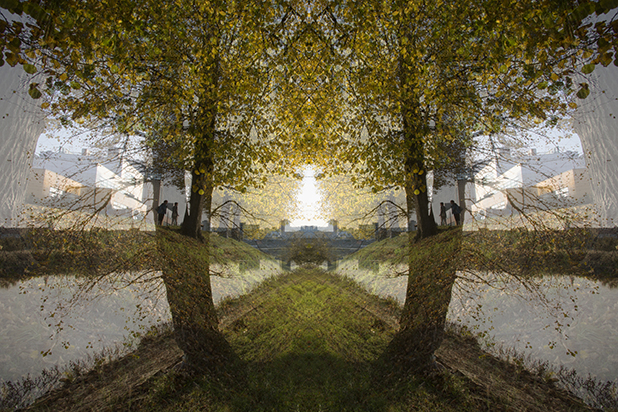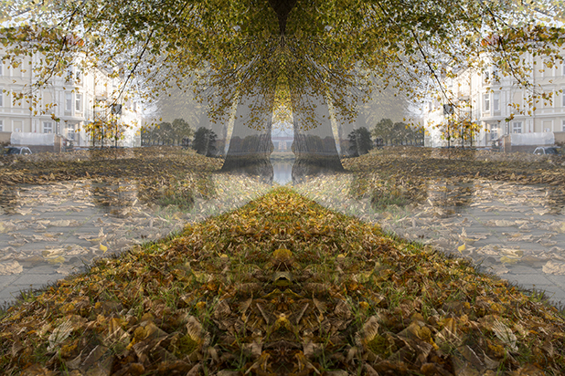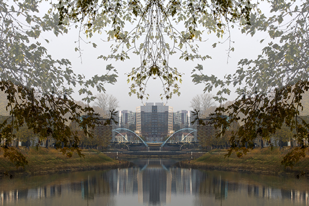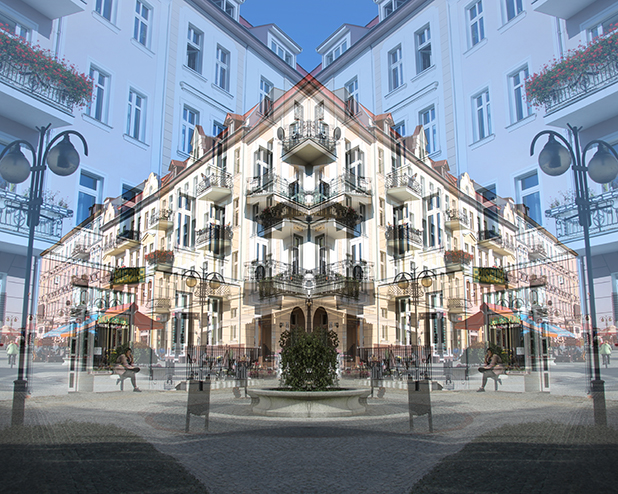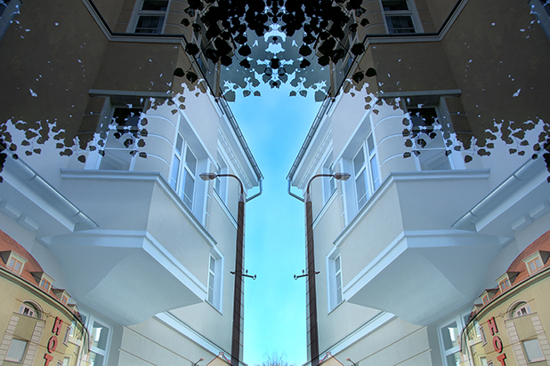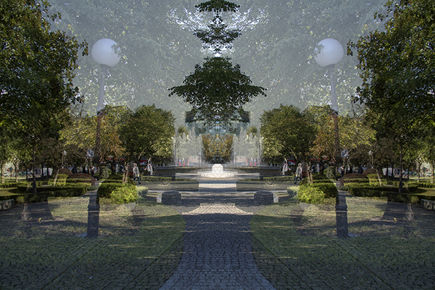 Dostarczam kadry ulic, parków, domów. Poprzez symetryczne podziały, odbicia i zwielokrotnienia sprawiam, że sfotografowana przestrzeń, tak materialna na co dzień, przestaje być rzeczywista, choć nadal znajoma w detalu, formie, nastroju. Inna, ale bliska – może to właśnie ta z przyszłości. Nakładam na siebie symetrycznie odwrócone obrazy. Uzyskuję wizerunki podwojone, jak w lustrzanym odbiciu.