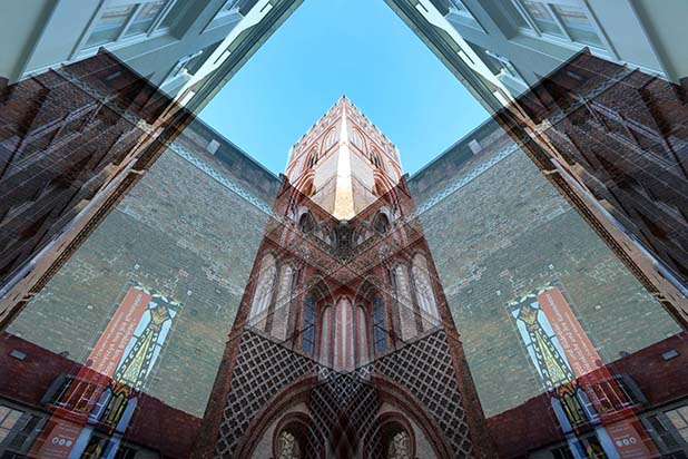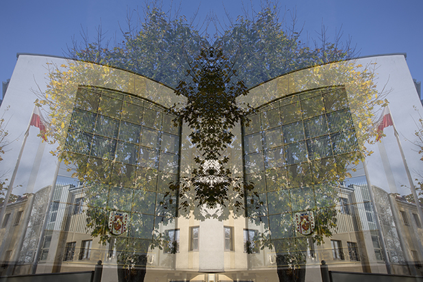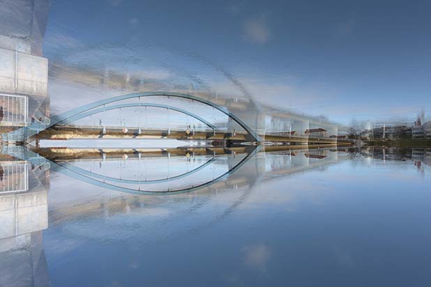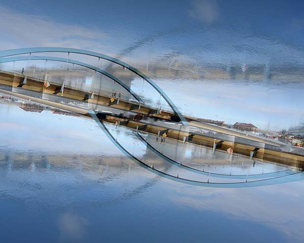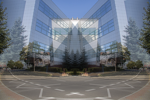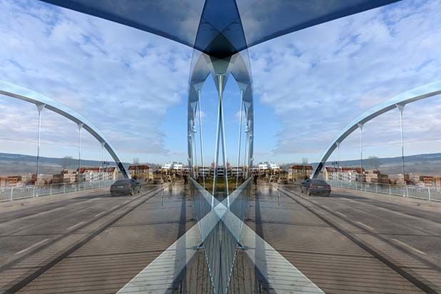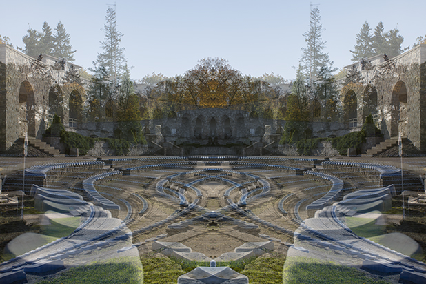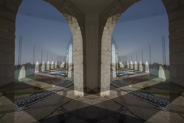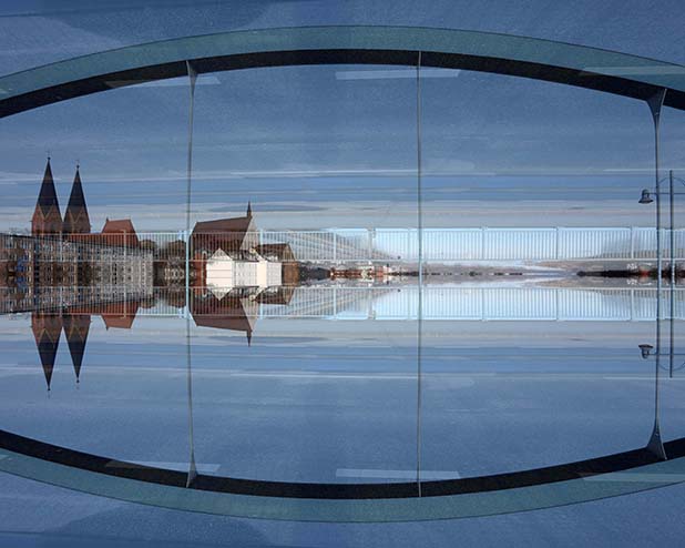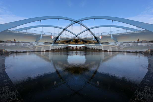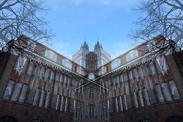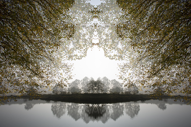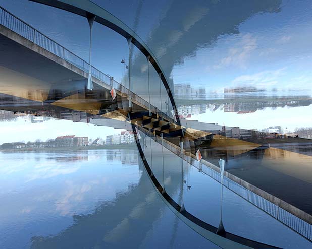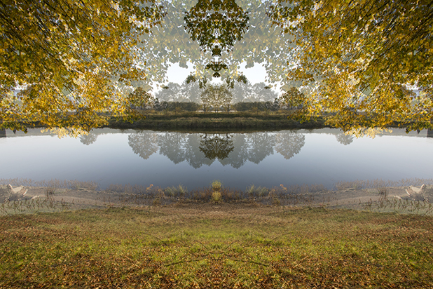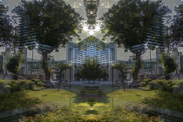 Dostarczam kadry ulic, parków, domów. Poprzez symetryczne podziały, odbicia i zwielokrotnienia sprawiam, że sfotografowana przestrzeń, tak materialna na co dzień, przestaje być rzeczywista, choć nadal znajoma w detalu, formie, nastroju. Inna, ale bliska – może to właśnie ta z przyszłości. Nakładam na siebie symetrycznie odwrócone obrazy. Uzyskuję wizerunki podwojone, jak w lustrzanym odbiciu.